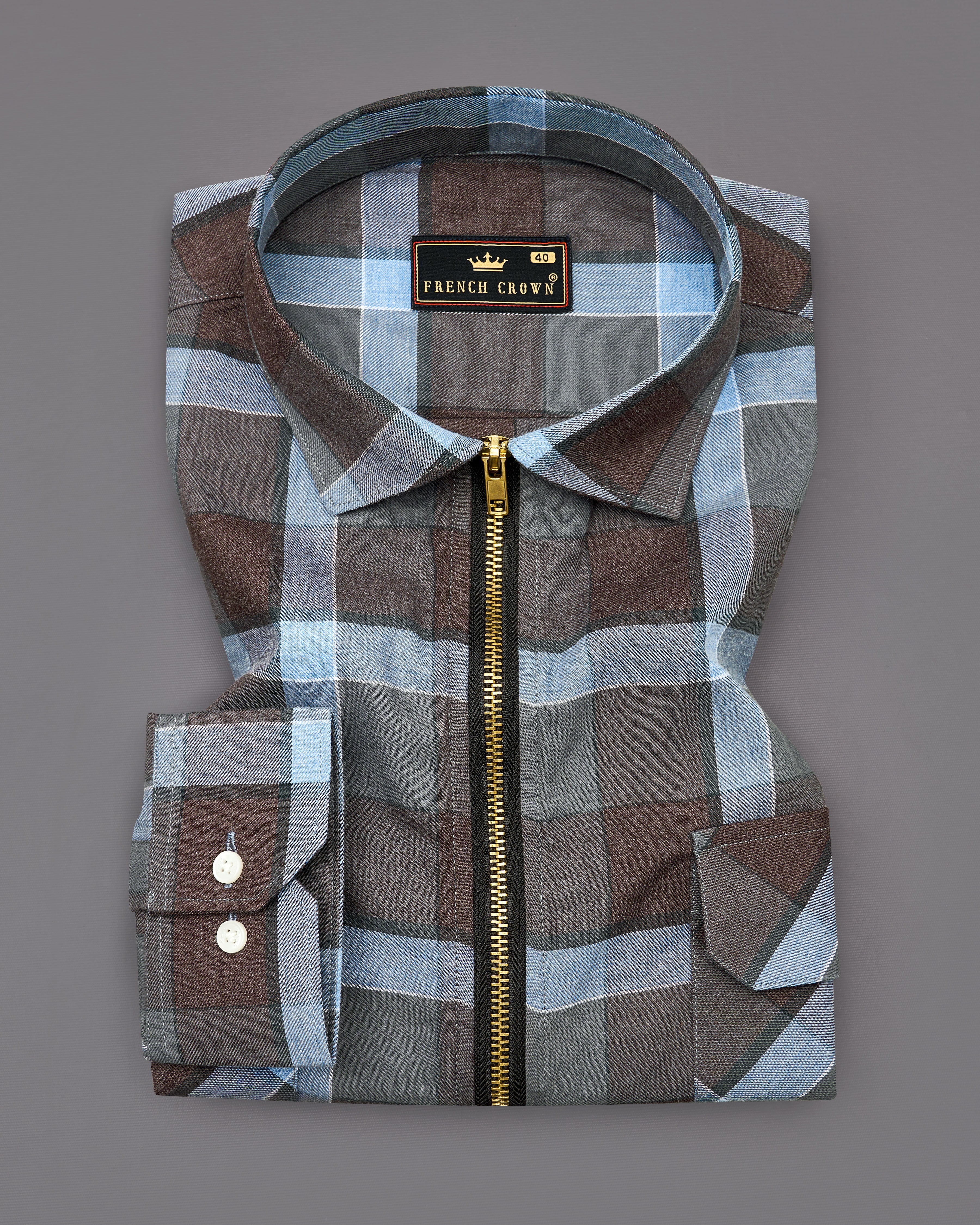 Emperor Brown with Carolina Blue Plaid Royal Oxford Overshirt/Shacket with Zipper Closure