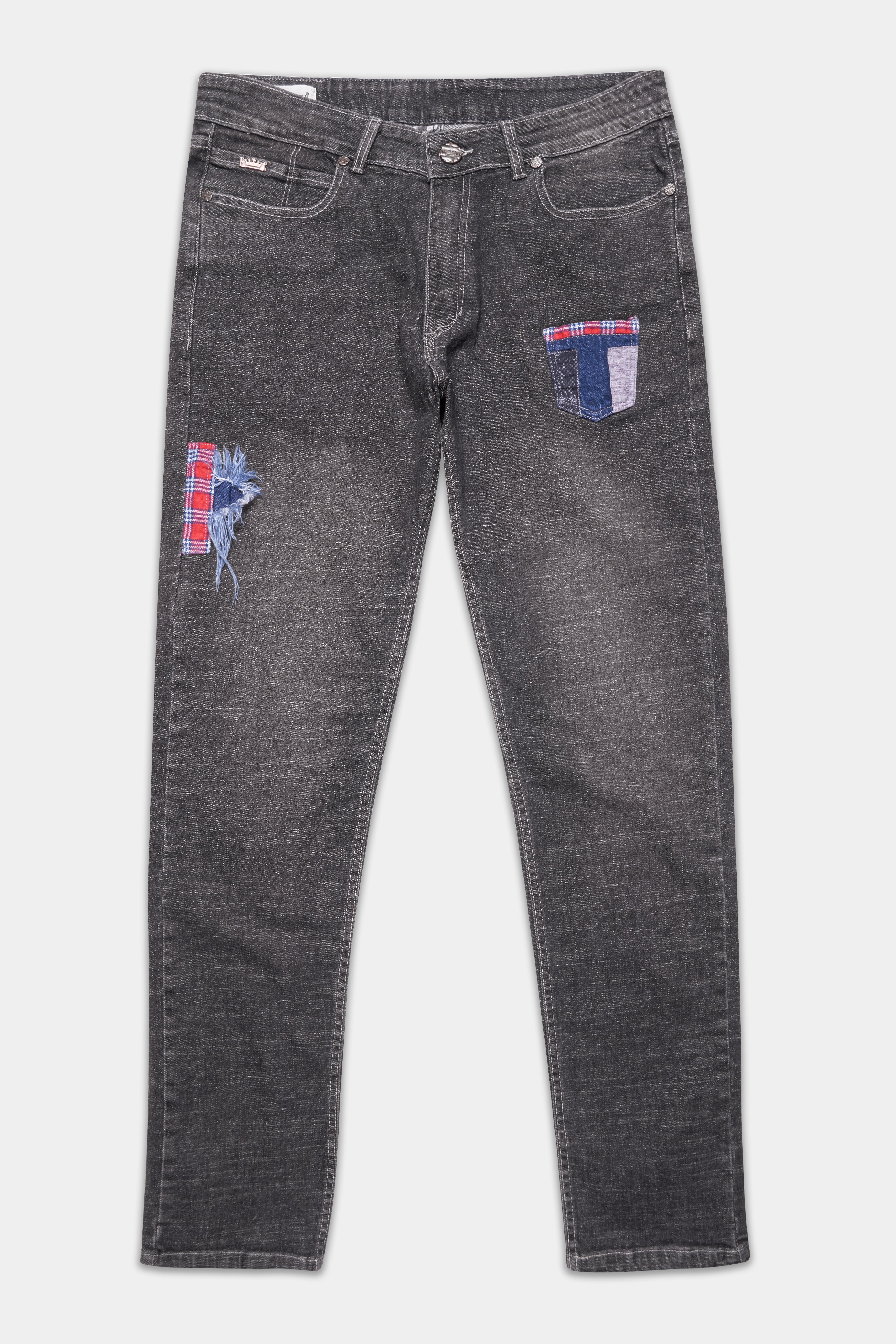 Thunder Black Mildly Distressed Patch Work Whiskering Wash Stretchable Denim J258-30, J258-32, J258-34, J258-36, J258-38, J258-40Thunder Black Mildly Distressed Patch Work Whiskering Wash Stretchable Denim J258-30, J258-32, J258-34, J258-36, J258-38, J258-40