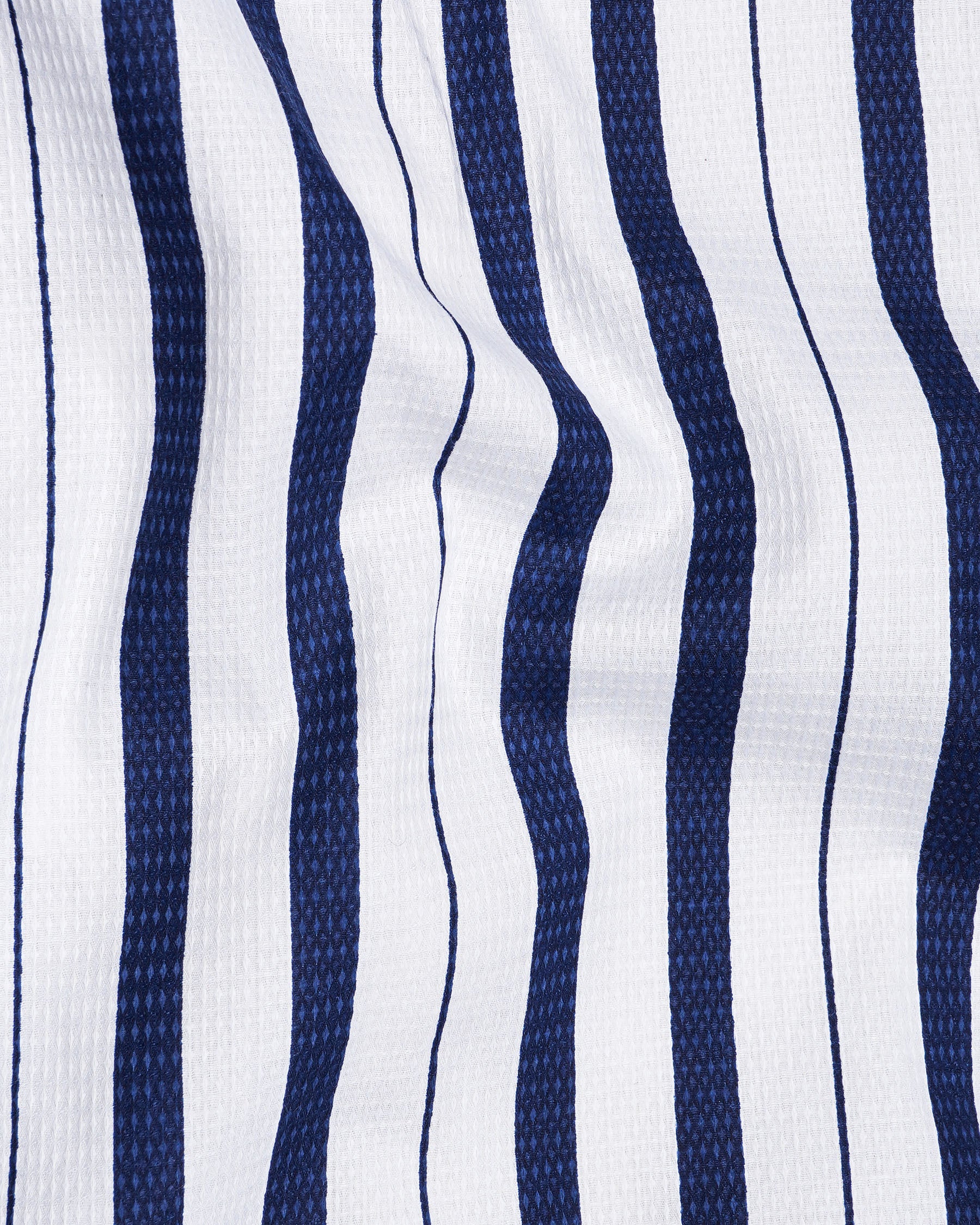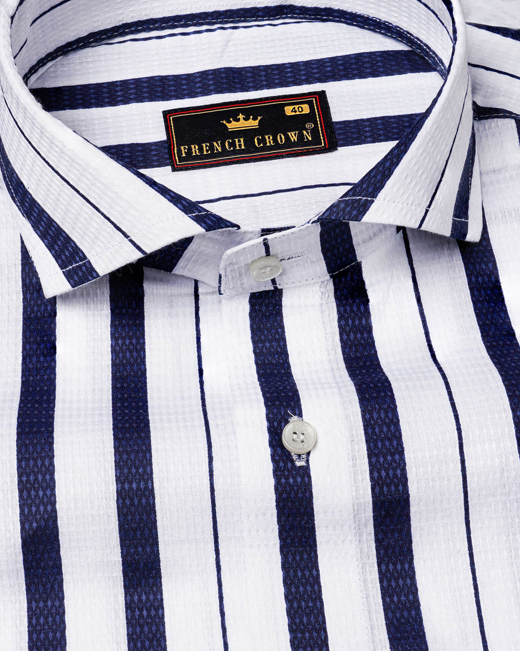 Bright White and Big Stone Blue Striped Dobby Textured Premium Giza Cotton Shirt