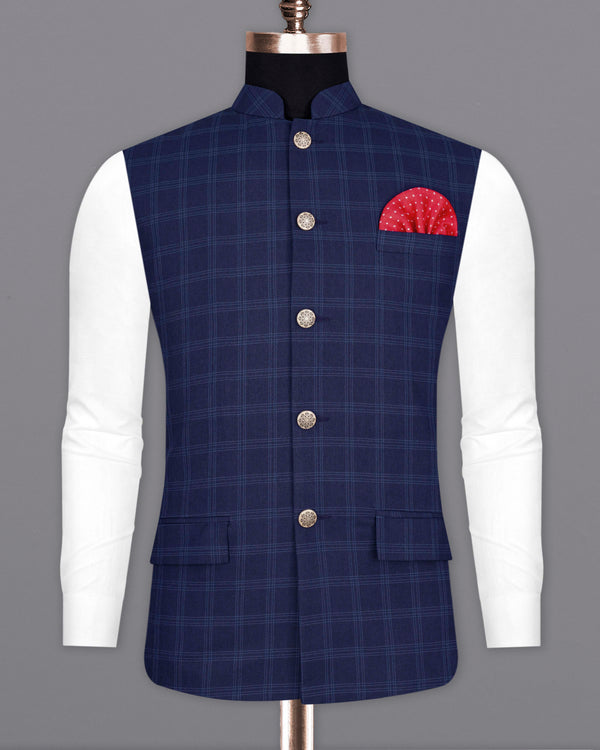 Baltic Sea Blue Windowpane Bandhgala Nehru Jacket WC2072-36, WC2072-38, WC2072-40, WC2072-42, WC2072-44, WC2072-46, WC2072-48, WC2072-50, WC2072-52, WC2072-54, WC2072-56, WC2072-58, WC2072-60