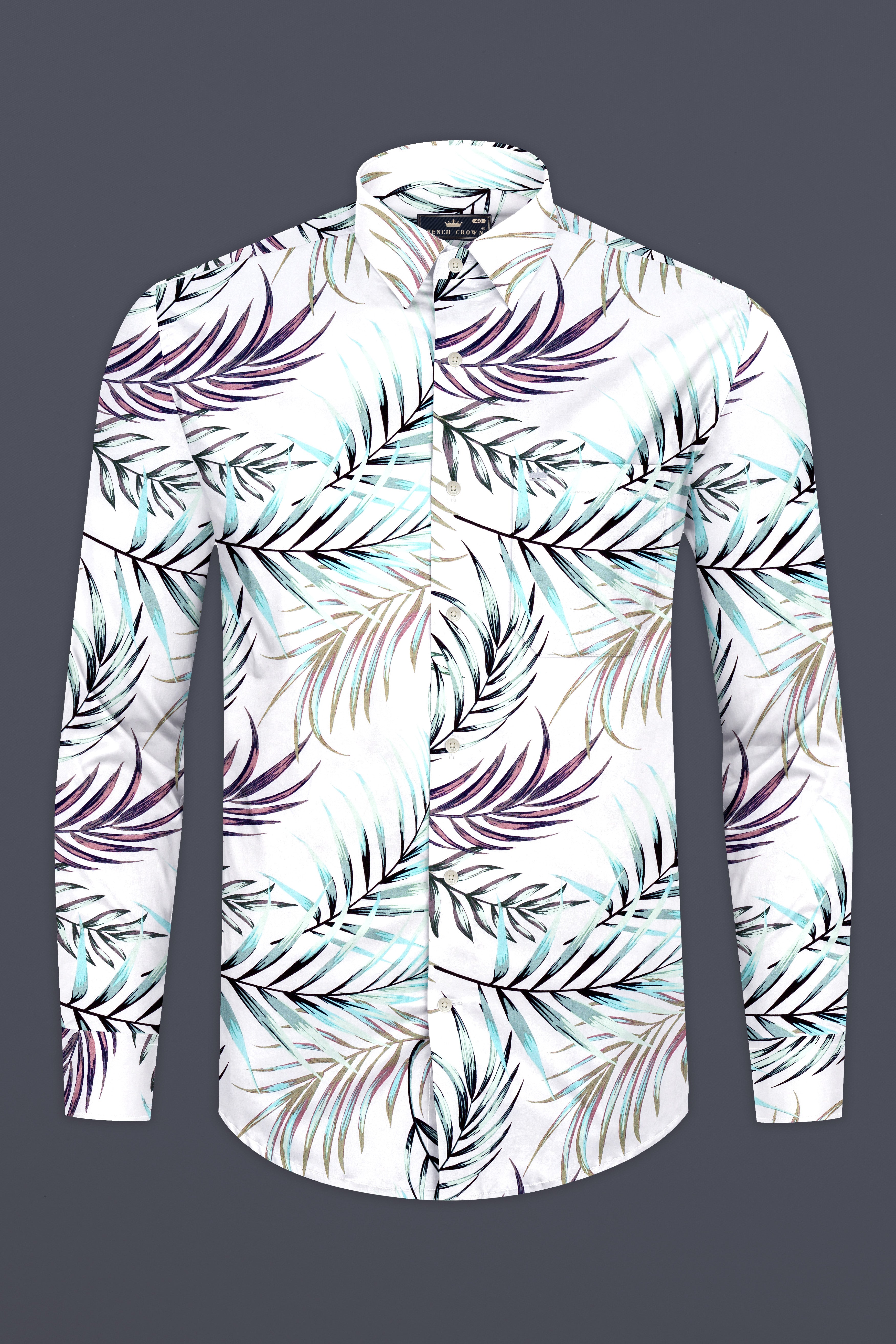 Bright White Multicolour Leaves Printed Premium Cotton Shirt