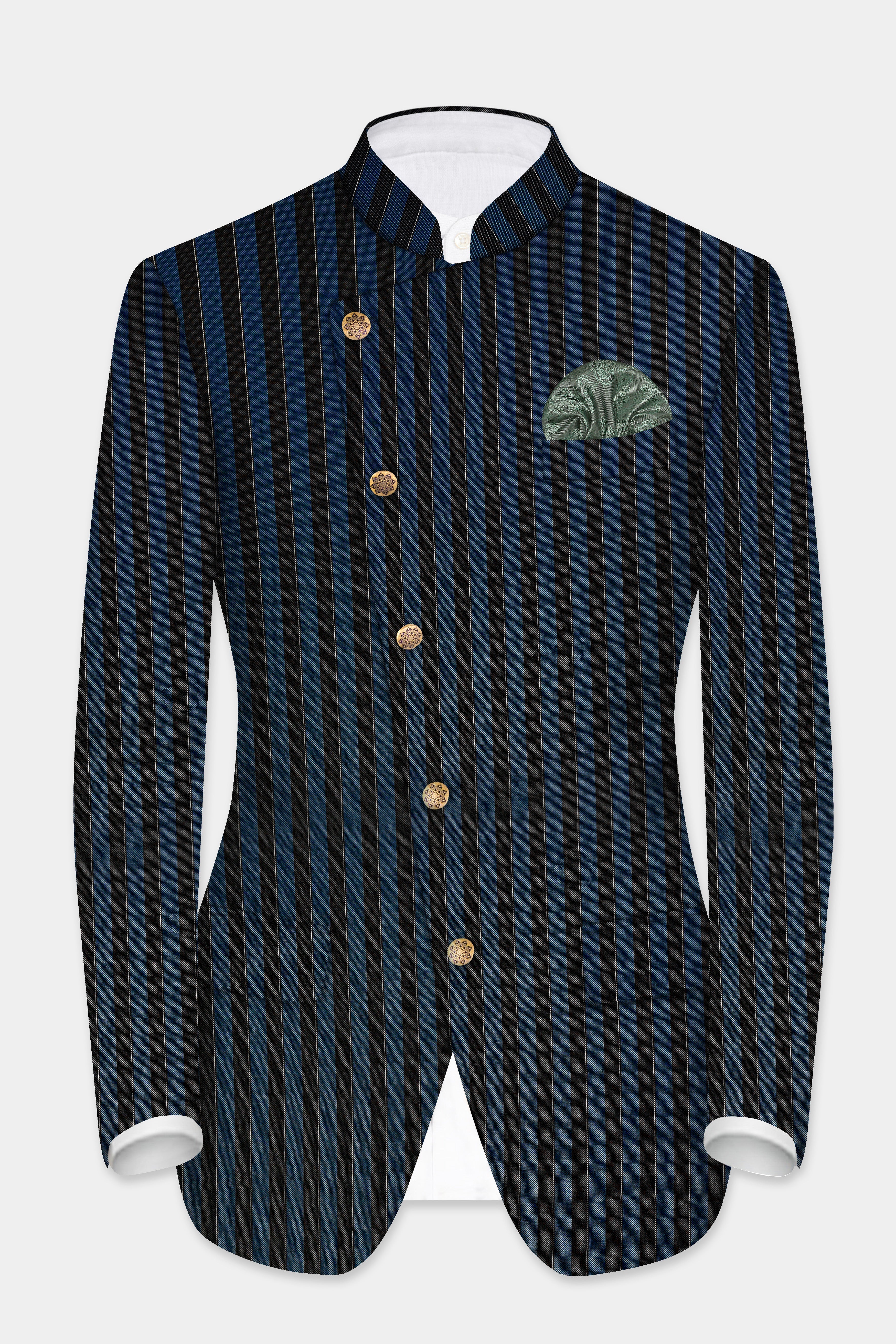 Daintree Blue And Jade Black Striped Wool Blend Cross Placket Bandhgala BlazerDaintree Blue And Jade Black Striped Wool Blend Cross Placket Bandhgala Blazer