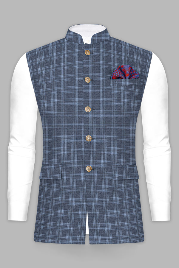 Dolphin And Casper Blue Checkered Cross Placket Bandhgala Wool Rich Blazer