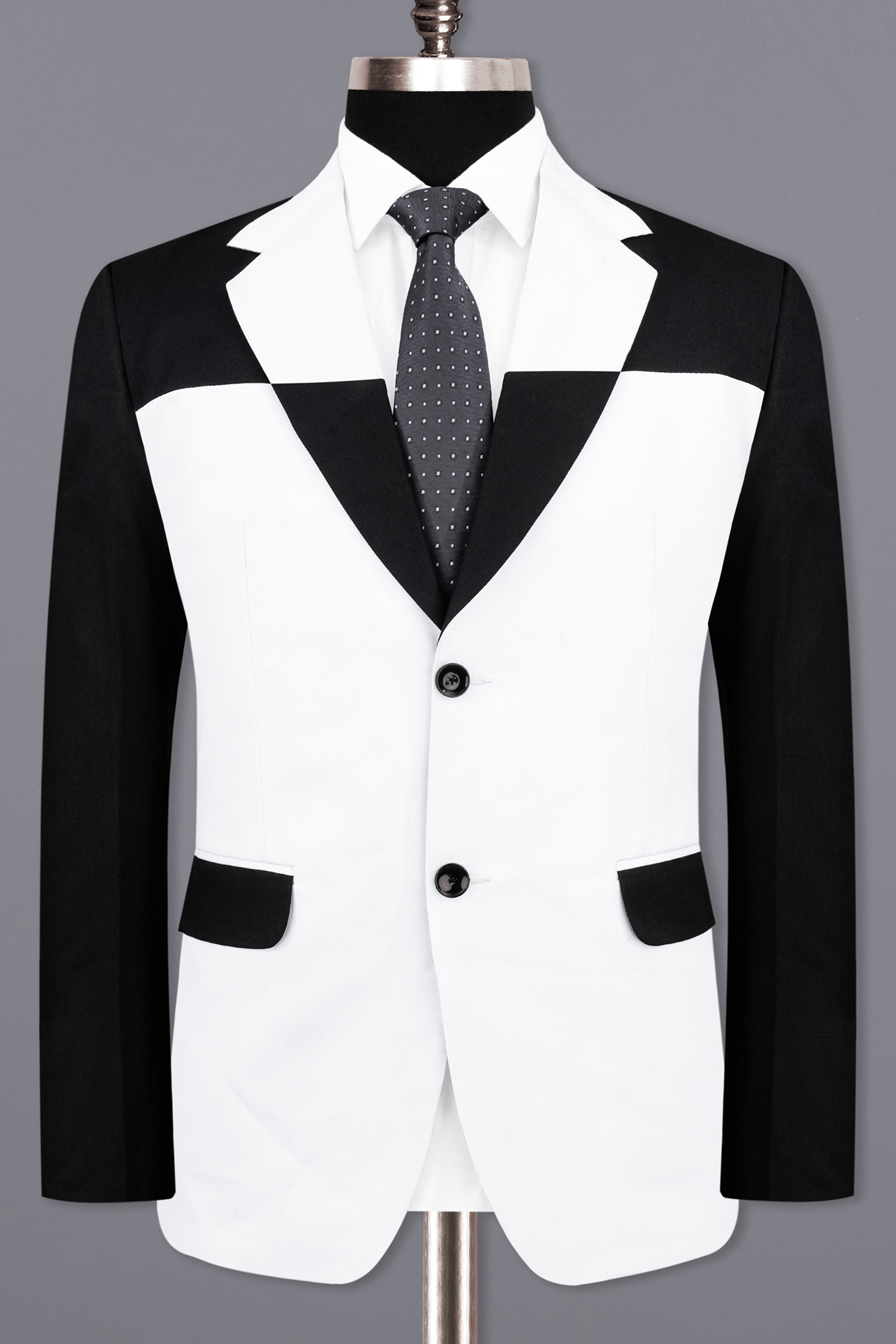 Bright White Stretchable Subtle Sheen and Black Single Breasted Designer Block BlazerBright White Stretchable Subtle Sheen and Black Single Breasted Designer Block Blazer