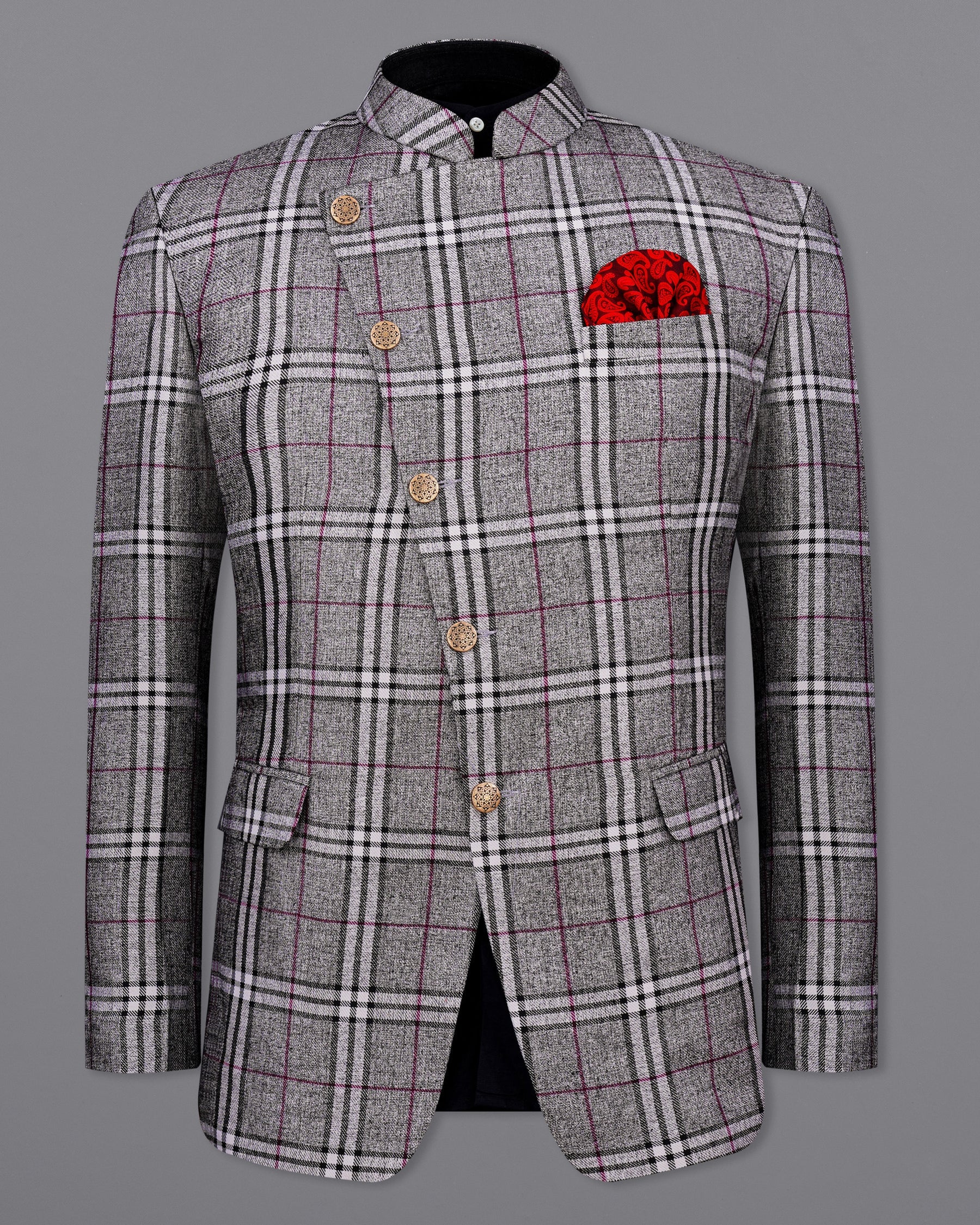 Bastille Grey Plaid Wool Rich Cross Placket Bandhgala Blazer