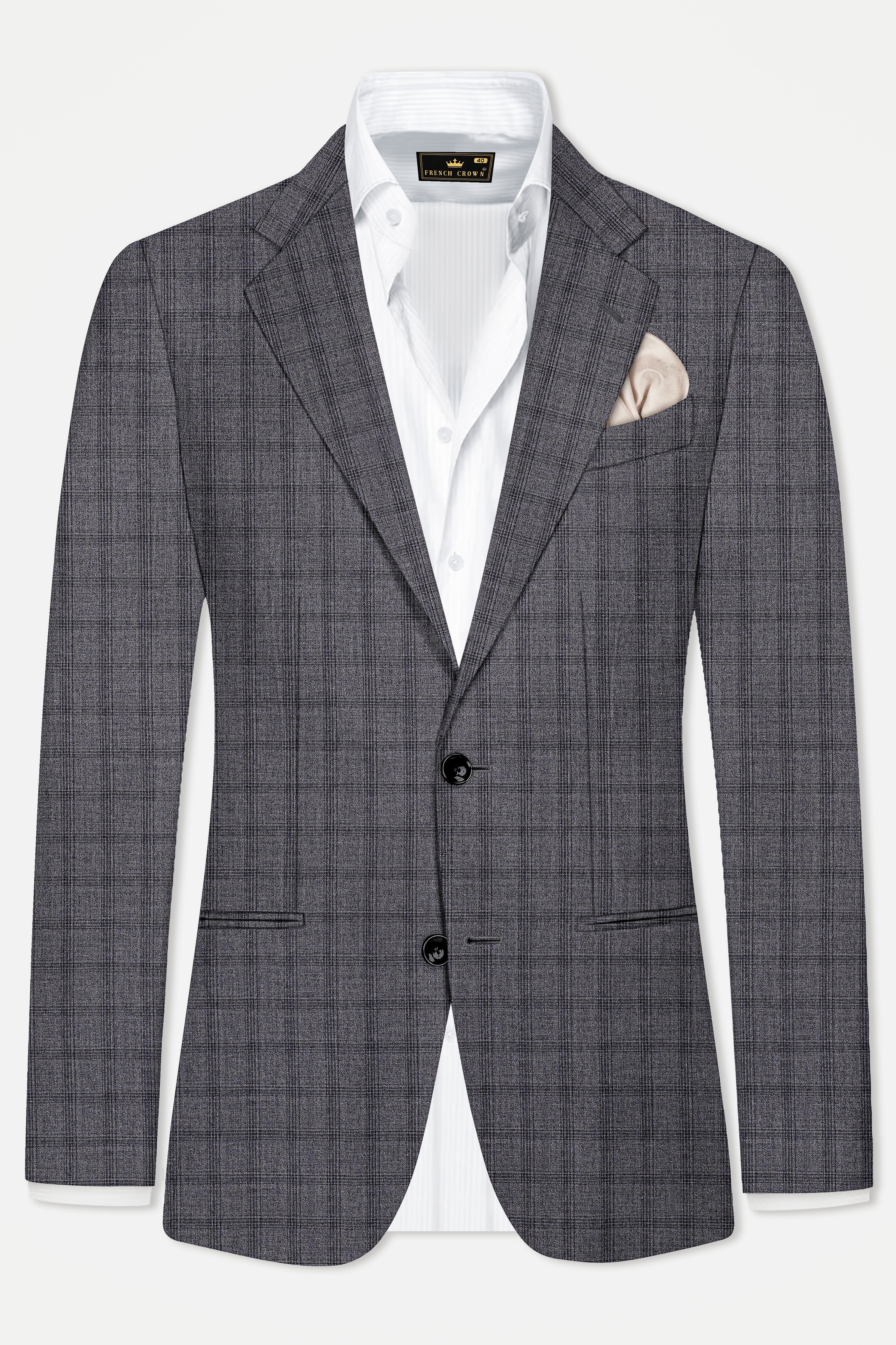 Gravel Gray Checked Wool Blend Single Breasted BlazerGravel Gray Checked Wool Blend Single Breasted Blazer