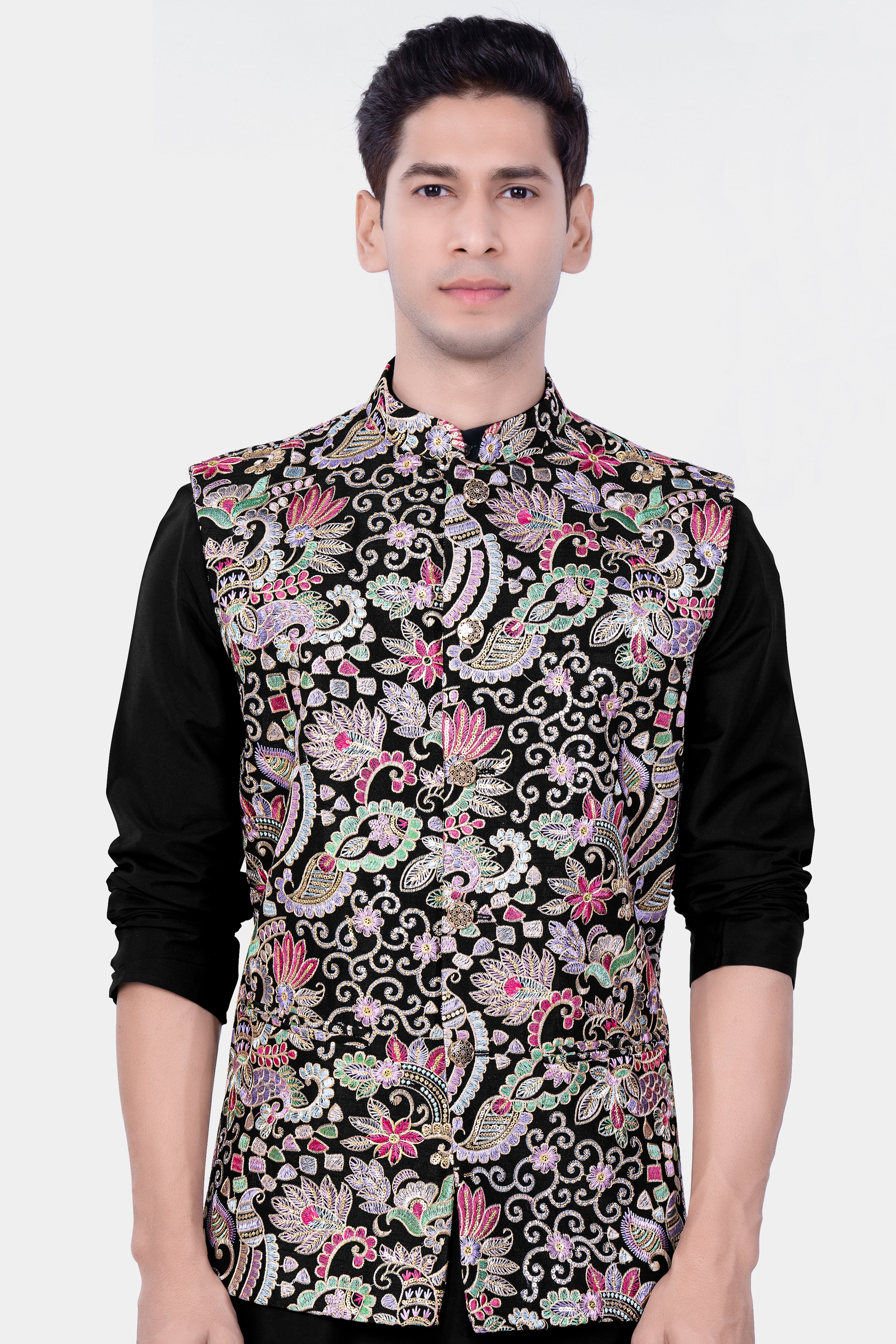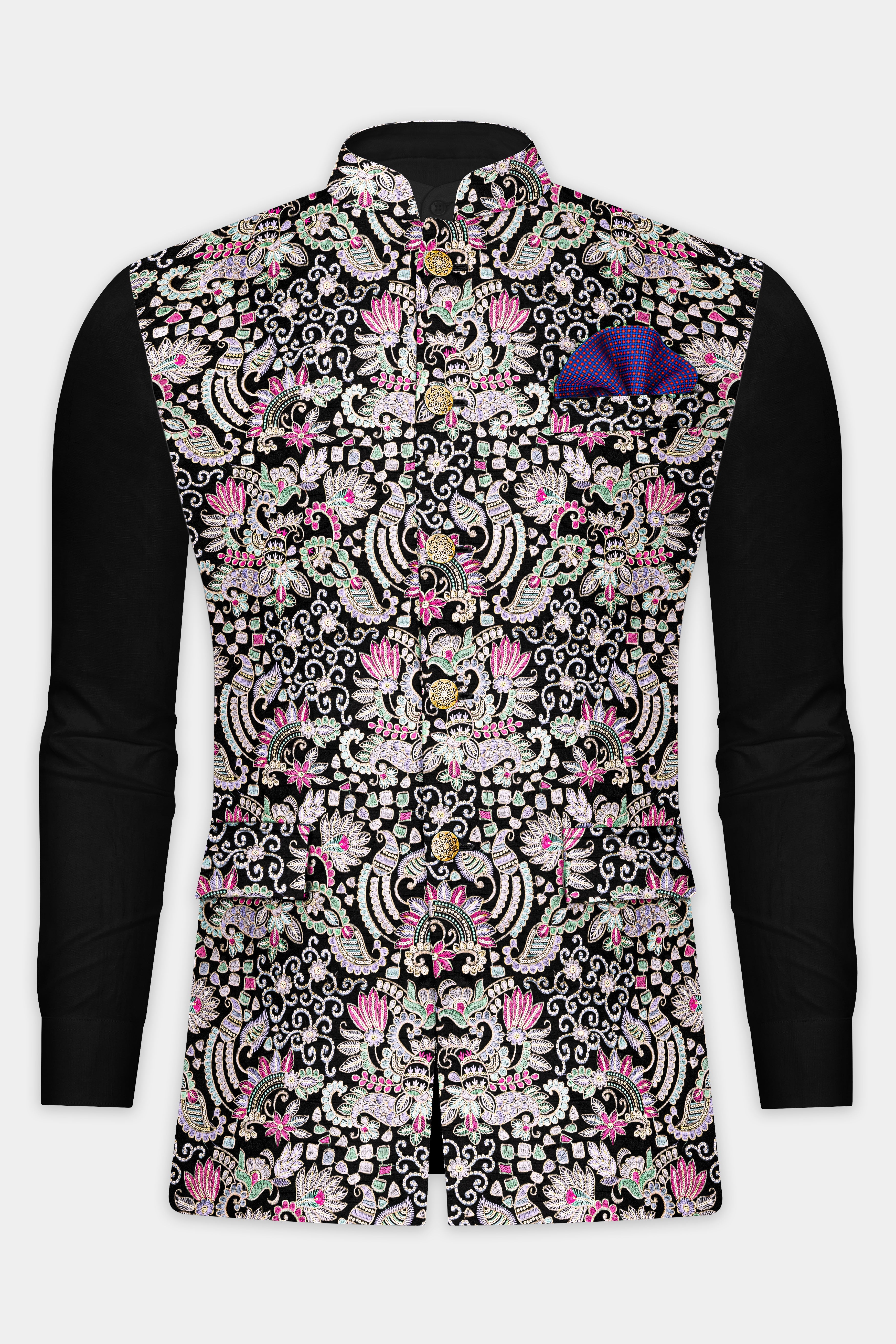 Introducing our exquisite Jade Black and Amethyst Purple Multi-Colour Designer Embroidered Nehru Jacket, a stunning addition to your wardrobe for weddings, engagements, or parties. Crafted with meticulous detail, this Nehru jacket effortlessly blends sophistication with casual charm. Pair it with our Kurta Jacket Set for a complete ensemble. Elevate your style with this timeless piece, tailored for the modern man who appreciates elegance and versatility.