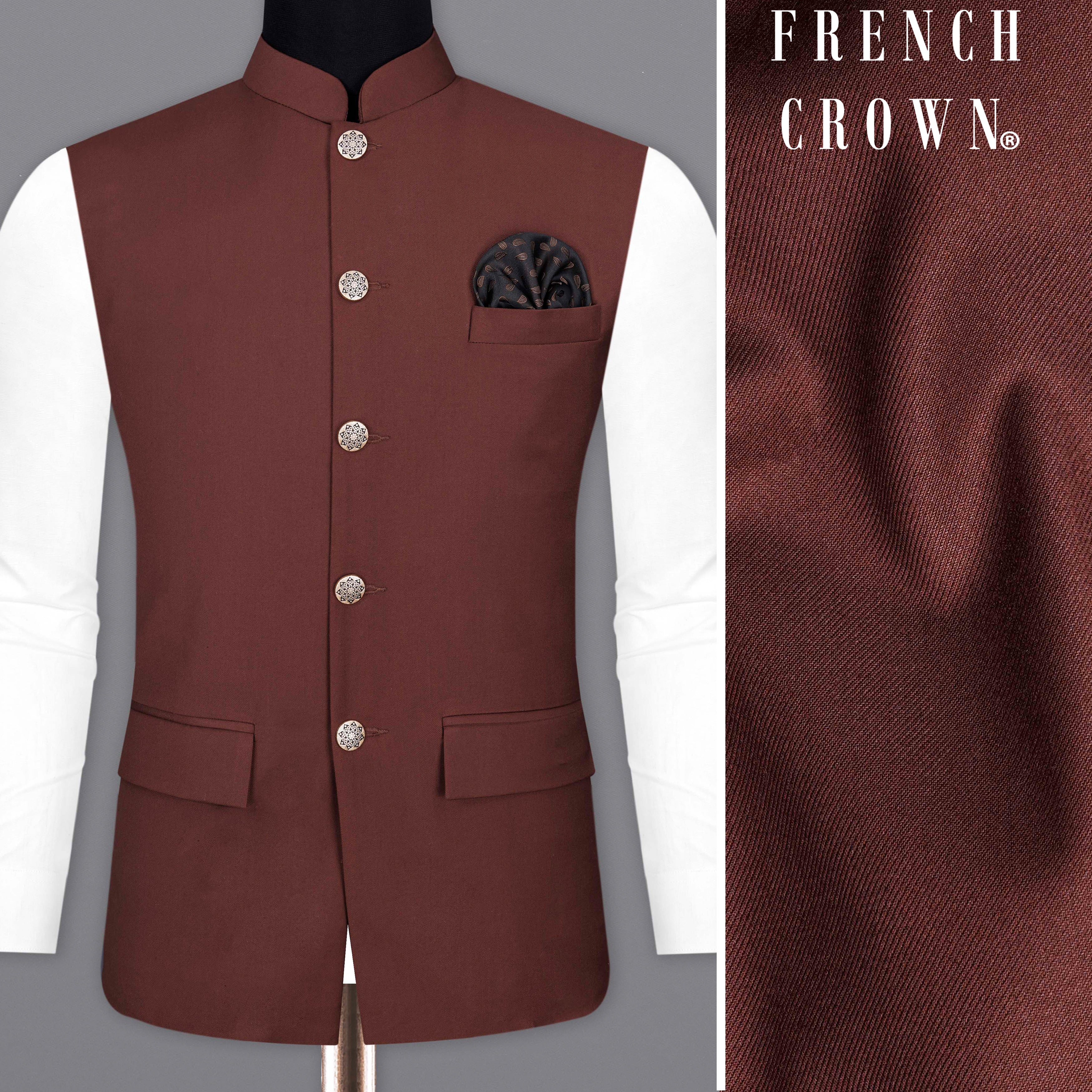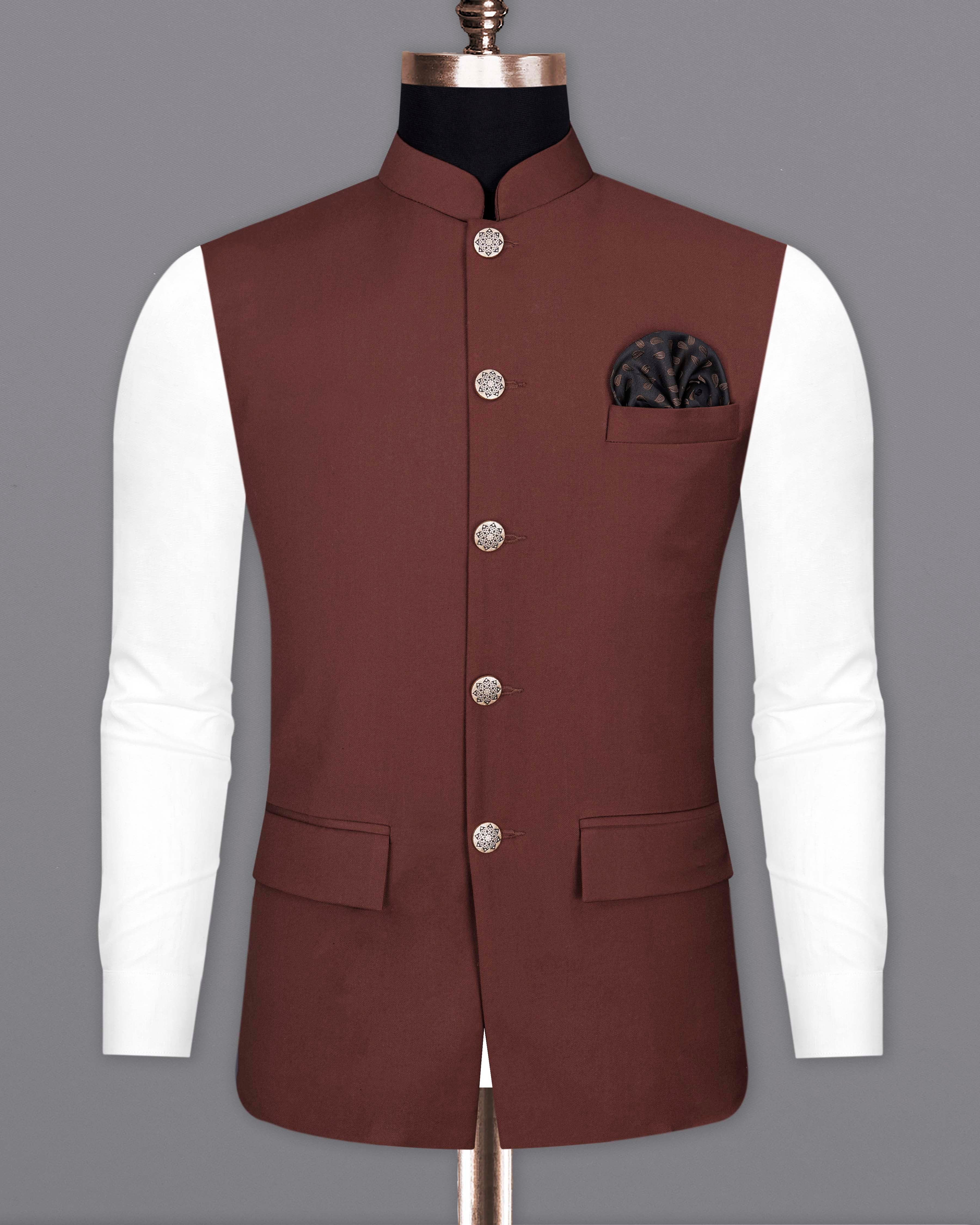 Put a twist on your closet with this solid brown bandhgala Nehru Jacket from French Crown that will turn heads. Tailored with precision by using high-quality fabric with adequate stretch, it is smooth on the skin. Club it with a white or light gray mandarin shirt, a pocket square, and oxford shoes to make your look stylish for any premium occasion.
