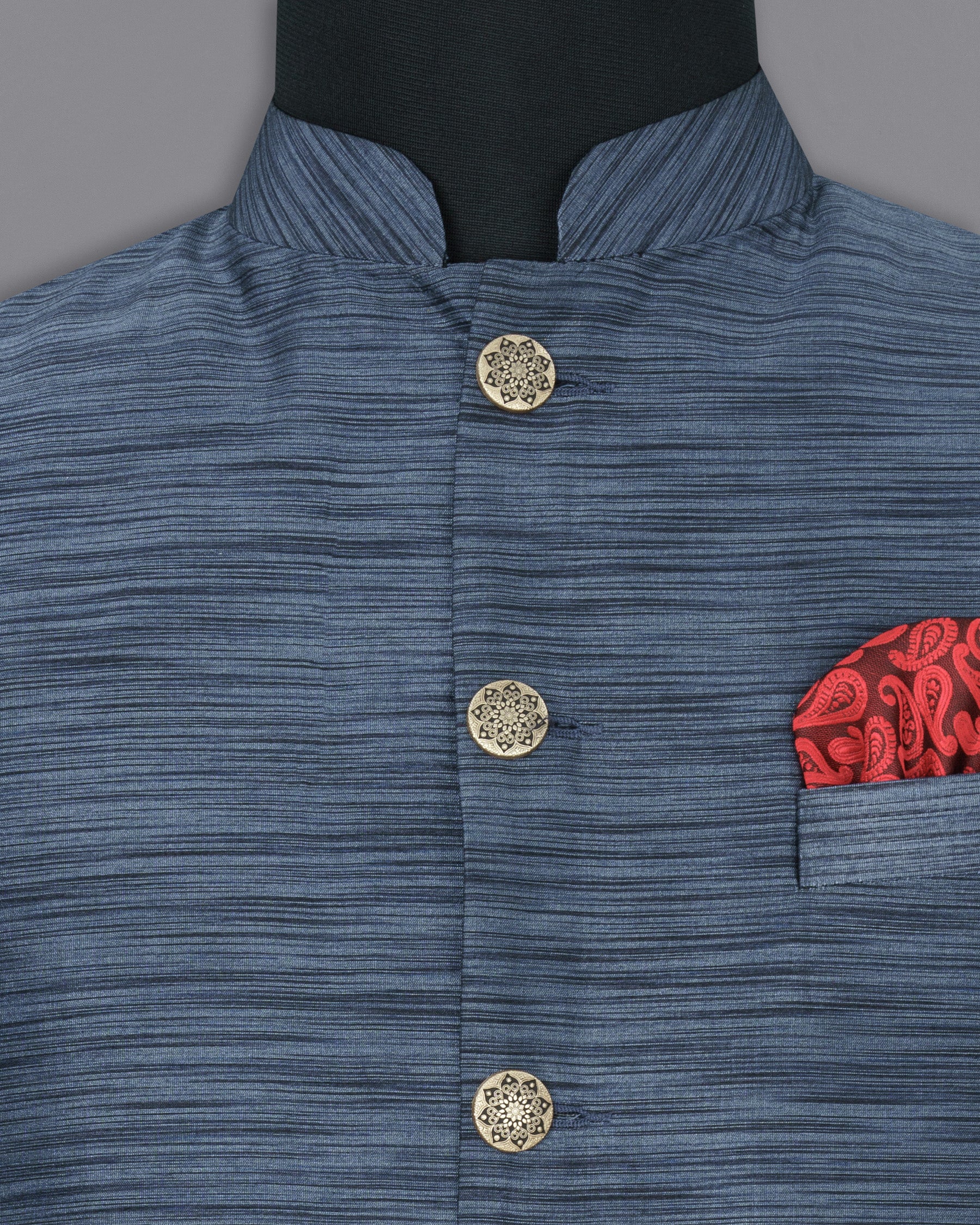 This impeccably cut lynch blue regular fit Nehru Jacket from French Crown creates a lasting impression. Featuring a button closure and a smooth finish, wear this Nehru Jacket with beautiful black monk shoes to complete your occasional attire.