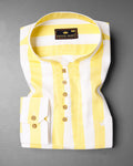 Let’s flaunt your day look with this sandwisp yellow with white stripes casual kurta shirt from the House of French Crown. Crafted in a regular fit, this shirt features a Mandarin collar, coconut shell button closure, and full sleeves. Wear it before heading out for dinner with your friends or family and club it with black chinos and loafers.