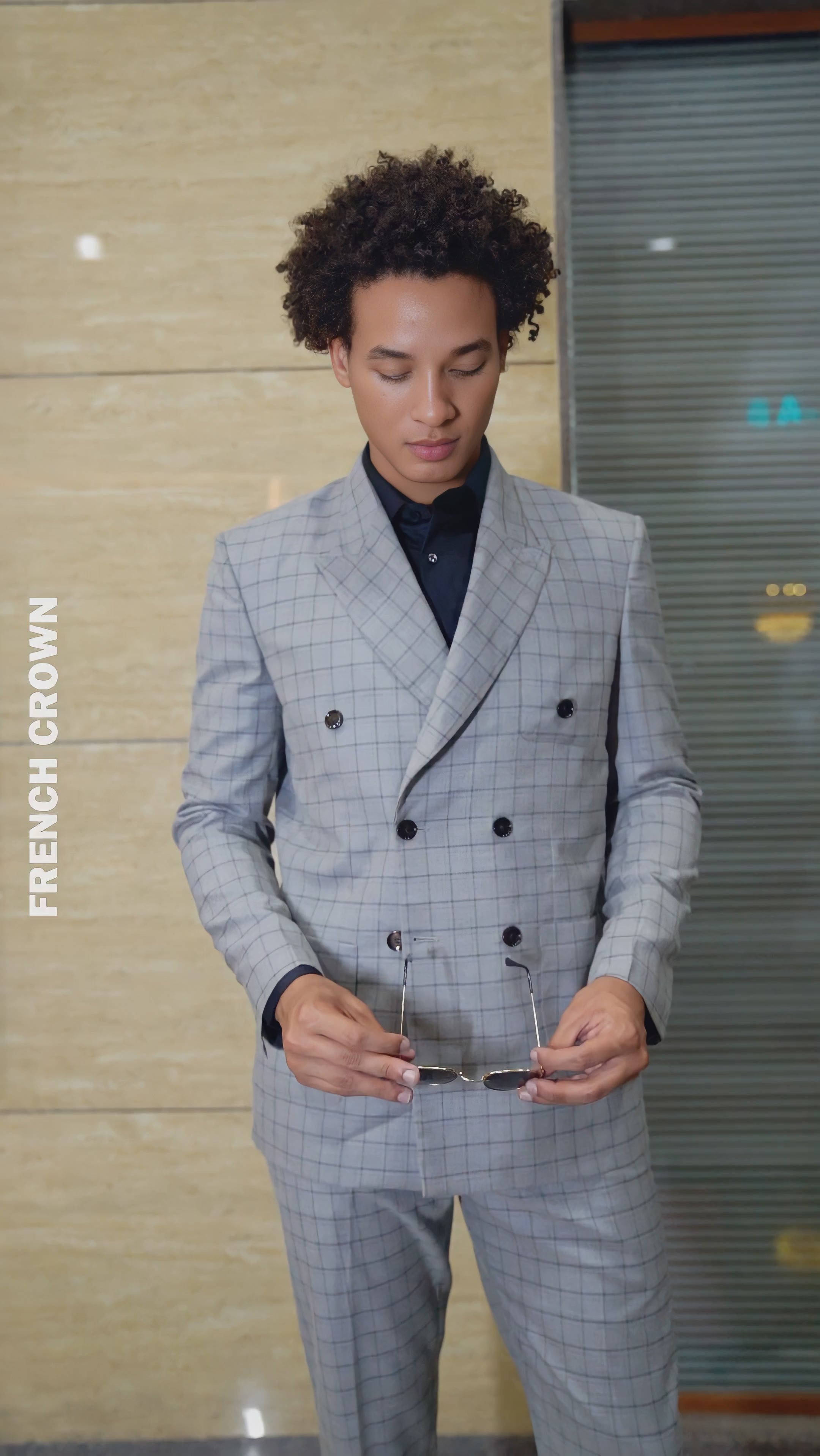 Cloud Gray Plaid Wool Rich Double Breasted Blazer